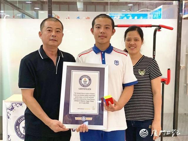 双腿勾在倒挂架的横杆上整个人倒吊着右手背在身后仅用左手飞速复原一个三阶魔方!7月12日厦门双十中学初三学生杨陈雨在中考前...